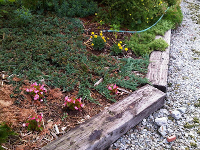 Now that the daffodils and tulips have died down, these impatiens are starting to grow. Surrounded by hosta, pachysandra, thyme